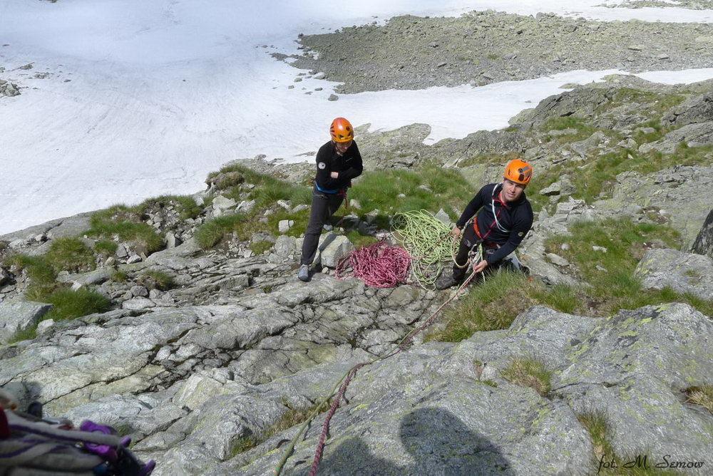 O samym wspinaniu nie będę się rozpisywał – opis drogi zamieszczam na osobnej podstronie. Cała wycieczka zabrała nam ok. 13 godzin z auta do auta, na co wpłynęły głównie przeciągające się zjazdy. Zresztą pod samą ścianę jest kawał drogi. Myślę że taka mała wyrypa na początek sezonu to fajna rzecz. Pogoda siadła, towarzystwo bardzo miłe (Asia i Krzysiek odbyli w ten sposób pierwszą wspinaczkę w Tatrach), sama droga należy do słowackich klasyków. Ale te Baranie Rogi to góra bardzo brzydka – wychodzimy na pola podszczytowe, a tu kupa gruzu. Żadnej strzelistości, nic. Trochę mi przykro z tego powodu. Na pocieszenie poszliśmy na hamburgery i piwo do budy w Starym Smokowcu.