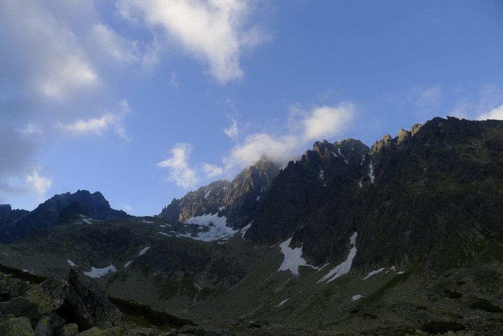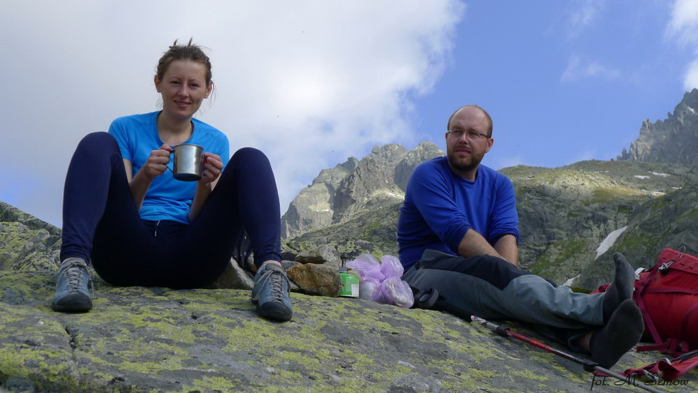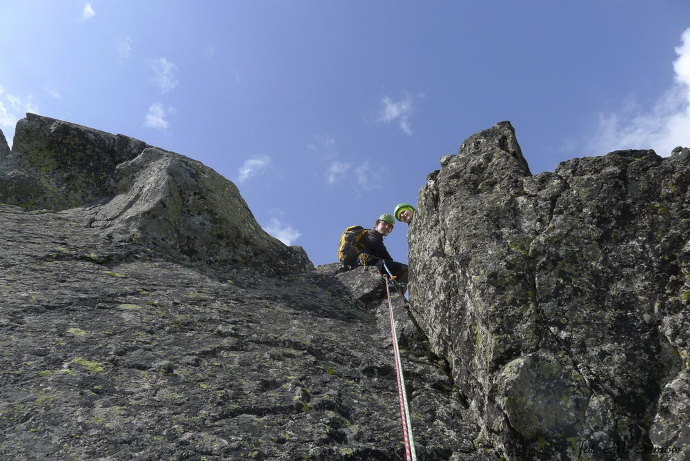 Wycieczkę rozpoczęliśmy w piątek wczesnym popołudniem. Nad Batyżowiecki Staw udało się dotrzeć jeszcze przed zmrokiem. Już w zapadających ciemnościach dociera druga część ekipy – Asia, Krzyś i Groszek. Nie jest zimno, więc do późna czuwamy przy świeczce i wiśniówce. W sobotę rano z Kanetem i Całką atakujemy filar Čihuli. Opis drogi na osobnej podstronie. Z przygodami, błądzeniem i powrotami na wlaściwy przebieg, po krótkim zejściu granią i zjazdami z zaklinowaną liną (dobrze spotkać znajomych w ścianie!), po 13 godzinach akcji wracamy nad staw. Czas kiepski, ale za to mamy poczucie dobrze wykorzystanego dnia. Nawet deszcz na zejściu nie psuje humorów, tym bardziej że jutro czeka nas tylko zejście do auta 🙂