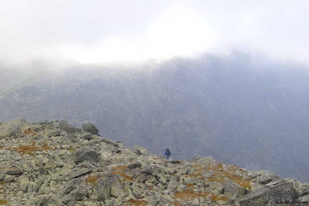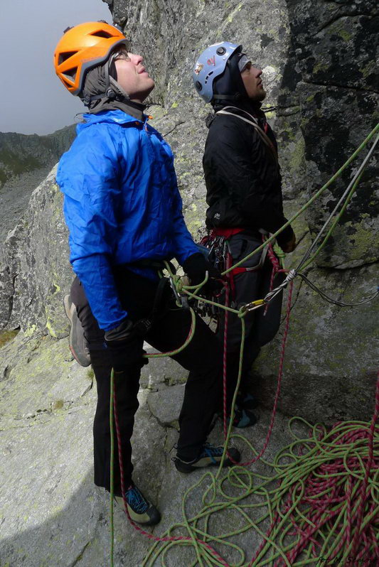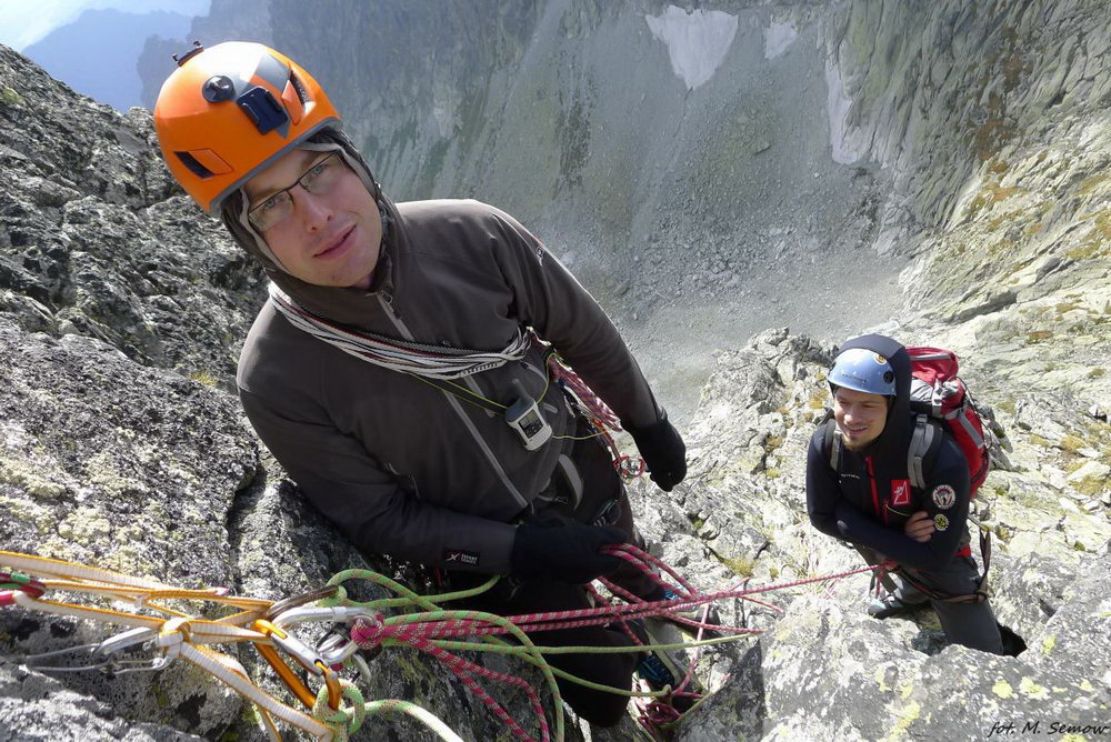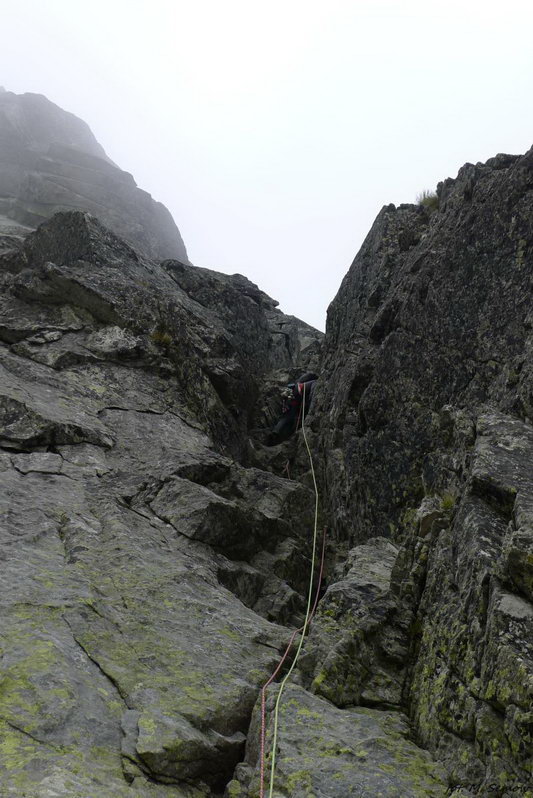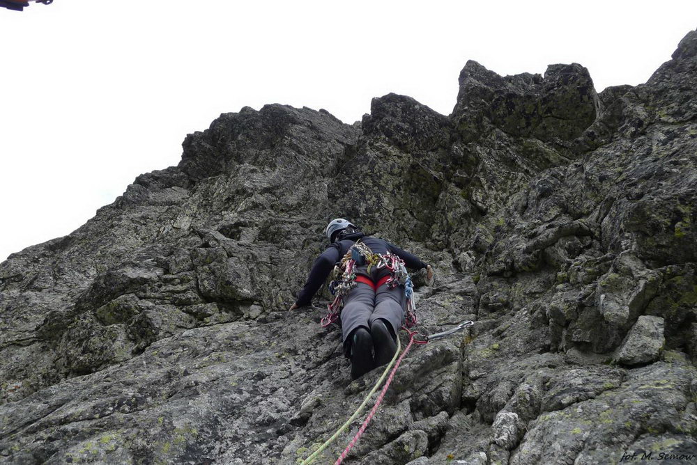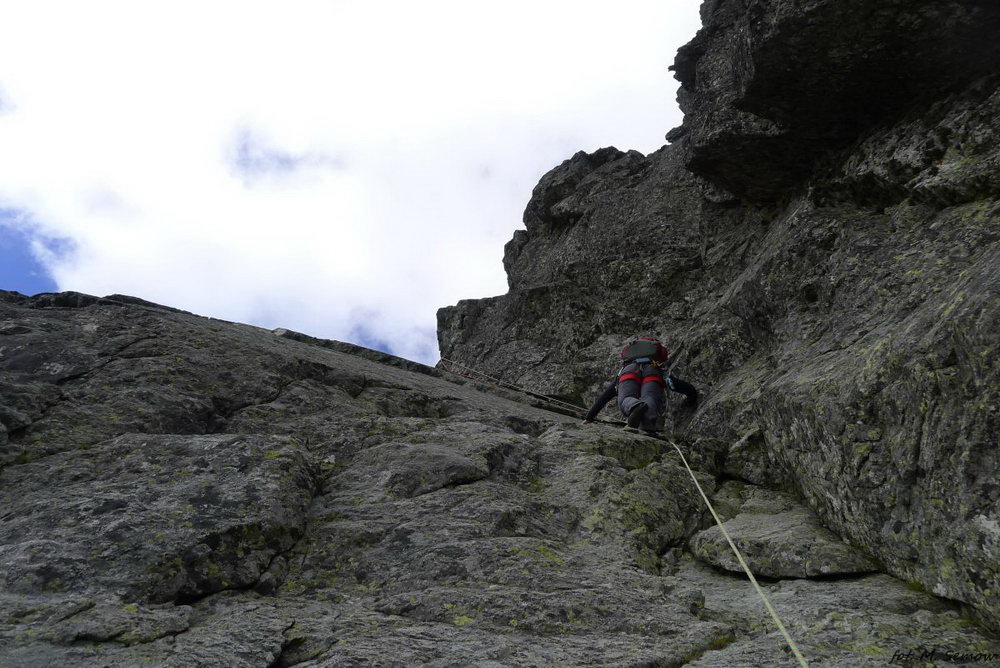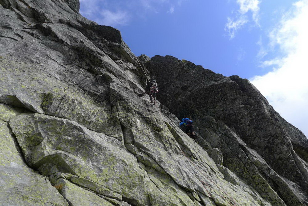 Choć zza chmur co i rusz wyglądało słońce, temperatura pod ścianą nie zachęcała. Do tego wiatr. Powiem krótko: dawno tak nie wymarzłem 🙂 Piątkowe miejsce na zachodnim filarze Ganku udało się przełoić na drugiego chyba tylko wiarą w to, że kikuty bez czucia na końcach ramion są ciągle zagięte i jakoś trzymają. Później już było lepiej. Piękne zacięcie, w które „zabłądziliśmy”, co prawda okazało się nie do końca lite i gdyby nie przytomna interwencja Gargamela, miałbym okazję odbyć szybką podróż na piargi w towarzystwie bloku odpękniętego od płyty. Urwanie rzeczonego bloku kolega przypłacił skasowaną dłonią i paroma siwymi włosami. Później już bez przygód popędziliśmy do góry, by z nieopisaną satysfakcją móc wpisać się do książki szczytowej Wielkiego Ganku. Kolejny dzień, mimo chęci przejścia choćby grani Szarpanych, kończy się na zjeździe znad komina Komarnickich. Cierpliwość w marznięciu ma swoje granice. W końcu to jeszcze lato. No, chyba że idzie zima…?