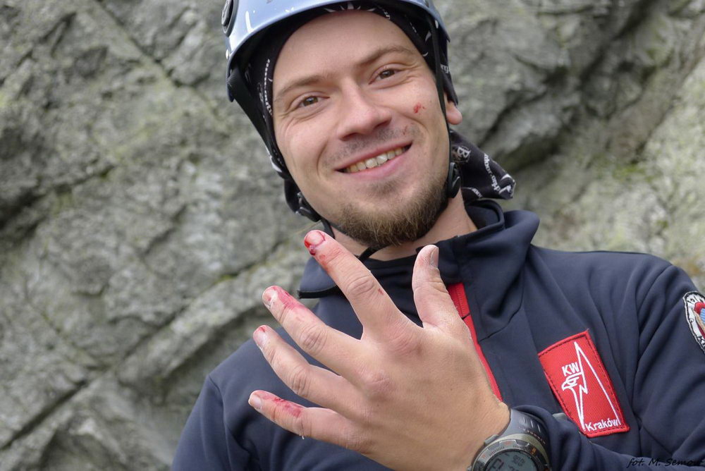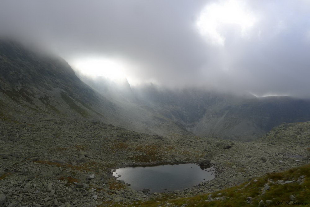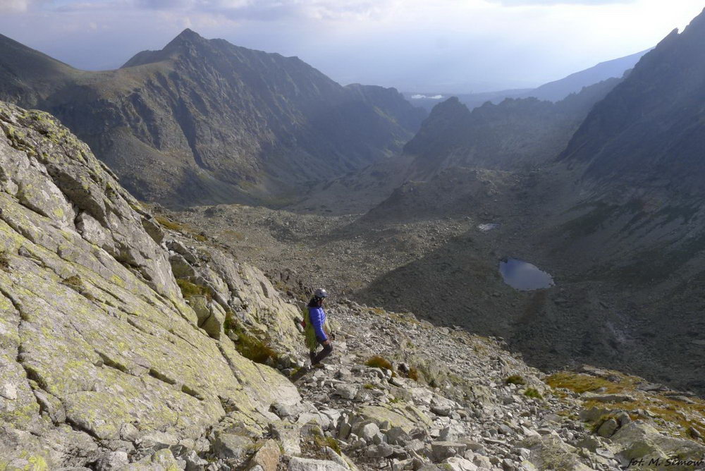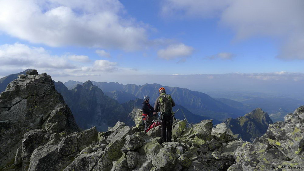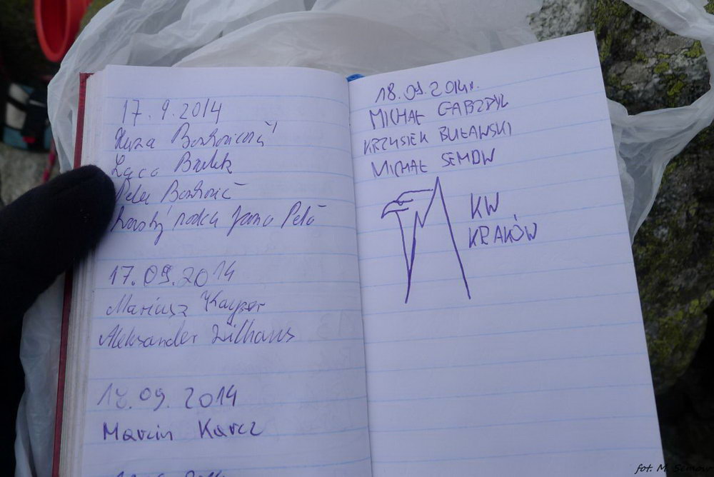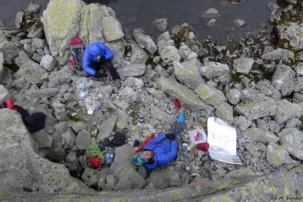 Choć zza chmur co i rusz wyglądało słońce, temperatura pod ścianą nie zachęcała. Do tego wiatr. Powiem krótko: dawno tak nie wymarzłem 🙂 Piątkowe miejsce na zachodnim filarze Ganku udało się przełoić na drugiego chyba tylko wiarą w to, że kikuty bez czucia na końcach ramion są ciągle zagięte i jakoś trzymają. Później już było lepiej. Piękne zacięcie, w które „zabłądziliśmy”, co prawda okazało się nie do końca lite i gdyby nie przytomna interwencja Gargamela, miałbym okazję odbyć szybką podróż na piargi w towarzystwie bloku odpękniętego od płyty. Urwanie rzeczonego bloku kolega przypłacił skasowaną dłonią i paroma siwymi włosami. Później już bez przygód popędziliśmy do góry, by z nieopisaną satysfakcją móc wpisać się do książki szczytowej Wielkiego Ganku. Kolejny dzień, mimo chęci przejścia choćby grani Szarpanych, kończy się na zjeździe znad komina Komarnickich. Cierpliwość w marznięciu ma swoje granice. W końcu to jeszcze lato. No, chyba że idzie zima…?